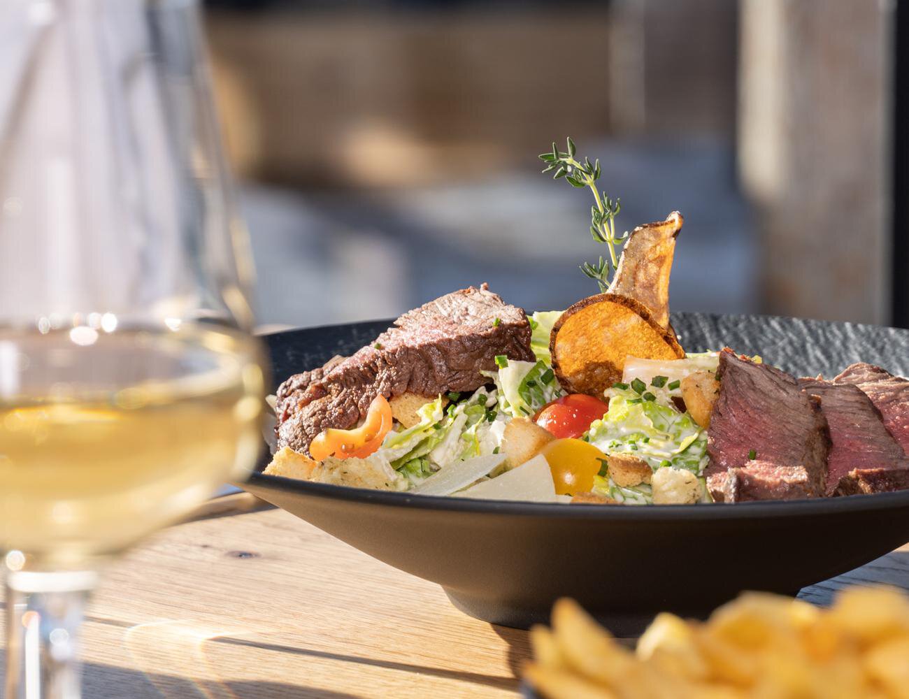 Hochwertiges Altholz in Verbindung mit modernen Materialien prägt den Charakter des Bedienungsrestaurants mit Galerie und angeschlossenem Lounge-Bereich. Bei sommerlichen Temperaturen lassen sich sowohl das Dach als auch die Fensterteile halbseitig öffnen. Zusätzliche Sitzplätze im Freien laden zum Sonnenanbeten mit Aussicht. Die integrierte Outdoorbühne bietet eine ideale Plattform für das vielseitige Unterhaltungsprogramm im Schigebiet Hochoetz.