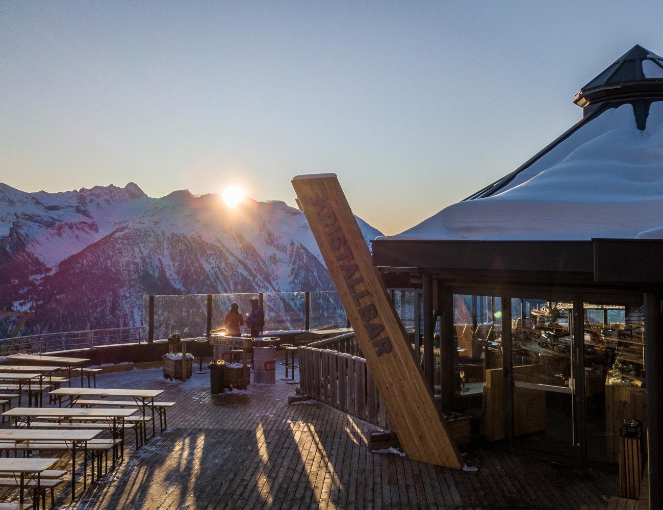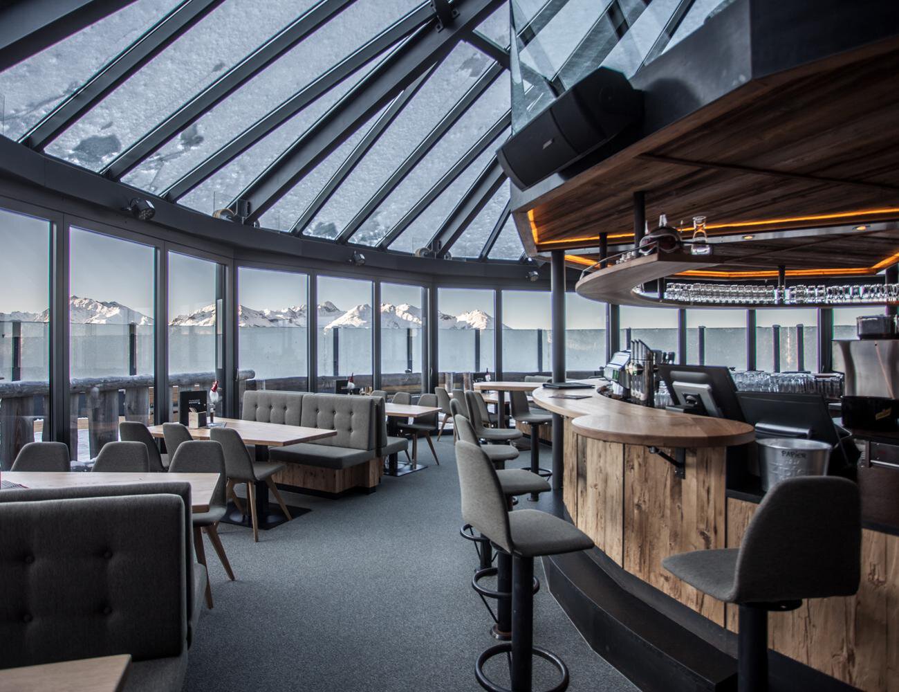 Die Kristallbar thront als eigenes Stockwerk hoch auf der Terrasse des Panoramarestaurants Hochoetz. Bei freiem Blick auf die Ötztaler Bergwelt lassen sich Genießer in stilvollem Ambiente verwöhnen.