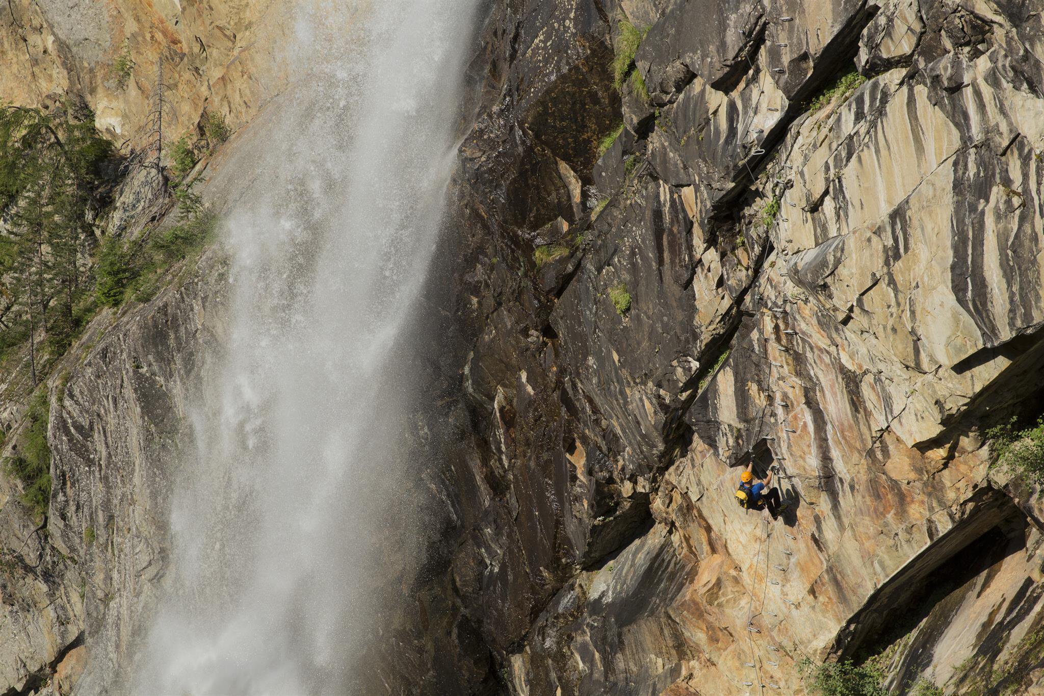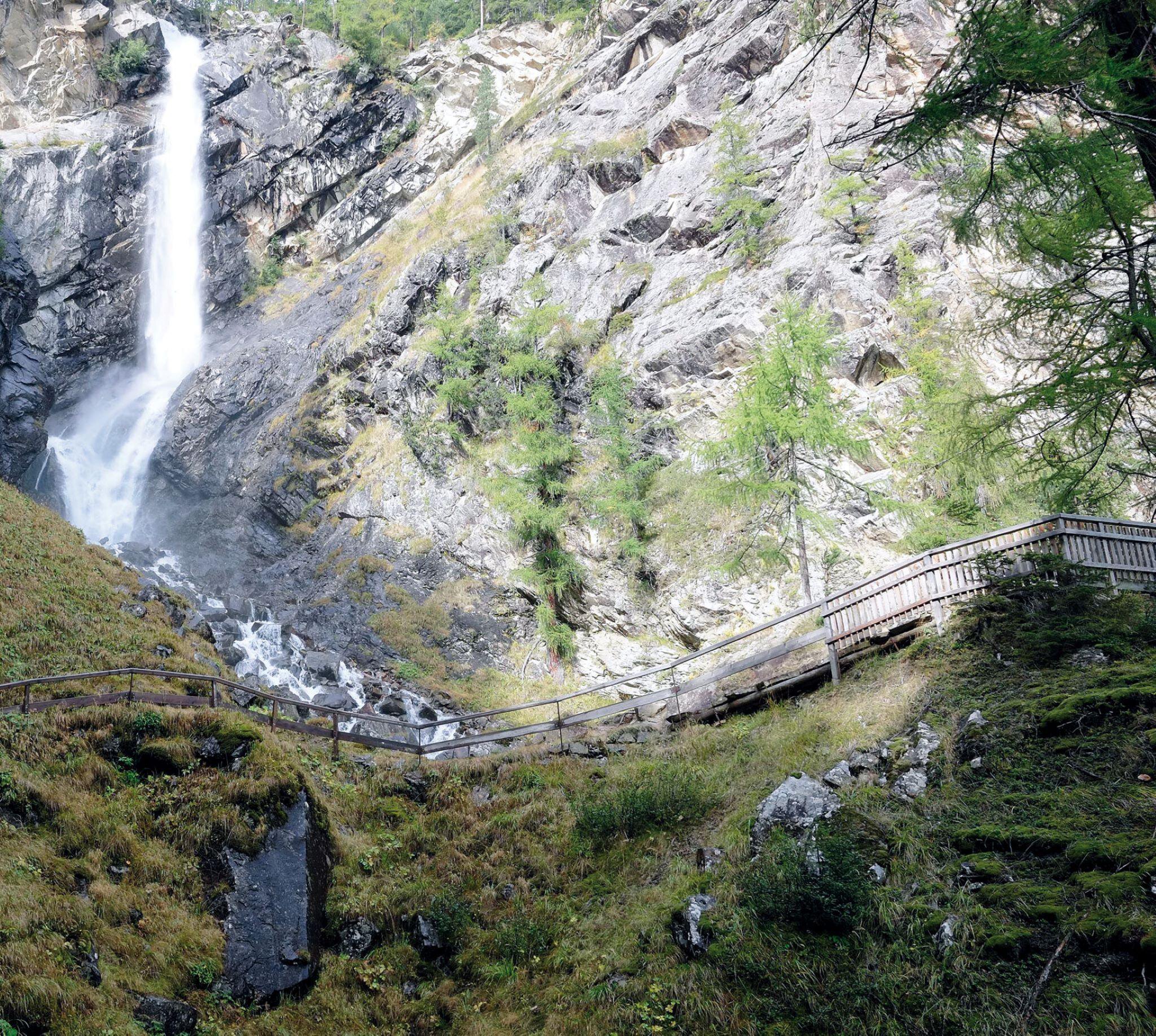Ein gut gewarteter Wandersteig begleitet den Fall bis auf etwa halbe Höhe und bietet gleich doppelten Genuss: Den hautnahen Blick auf die tosenden Wassermassen und das Schauspiel cooler Kletterer, die auf der anderen Seite an den Felsen hochkraxeln. Bänke laden zur Verschnaufpause ein, von einer geräumigen Holzplattform am oberen Ende öffnen sich großartige Fotomotive. Schön schattig ist die Wanderung durch den Lärchenwald und völlig ungefährlich, denn an steileren Stellen bietet ein Holzgeländer Halt.