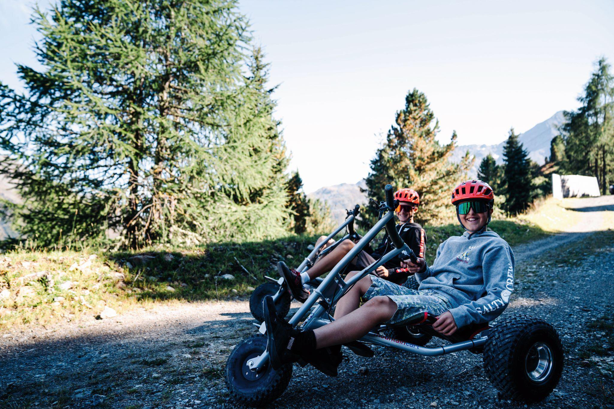 A Mountain Carts is a high-quality and robust fun sport device with three tyres that guarantees safe downhill riding fun. Easy to operate due to ergonomic seating position, safe and simple braking by means of dual-circuit disc brake system. Guaranteed fun for families with children, but also for an active and sports-minded public.