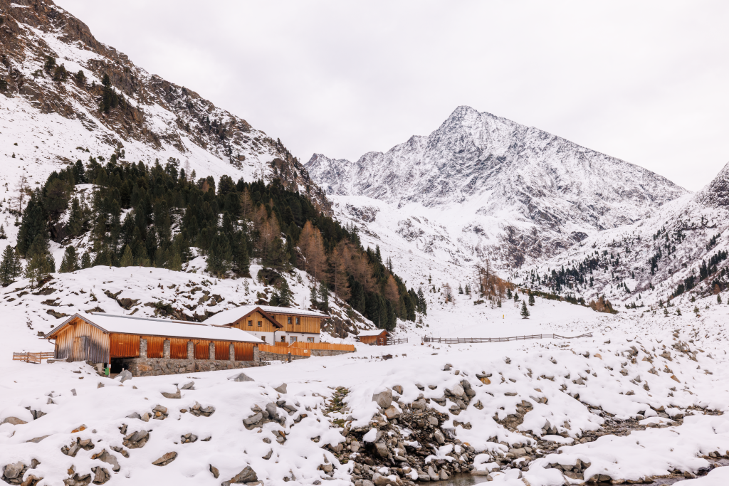 The Sulztalalm is located at an elevation of 1,915 m. From the Gries parking lot, the path initially leads level through meadows to the Vögelasbrücke. Continuing upward along the forest path, it takes about 1.5 hours of walking to reach the hut.