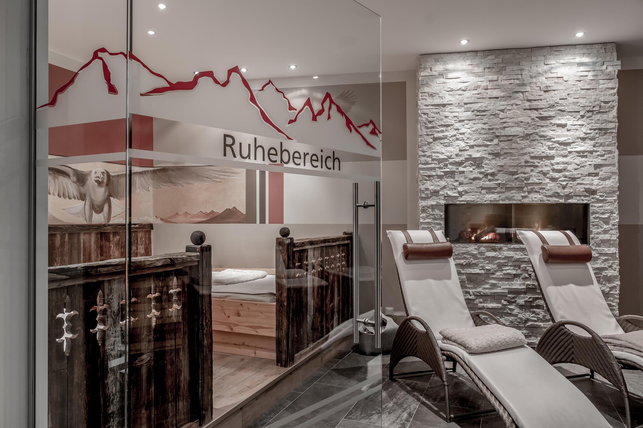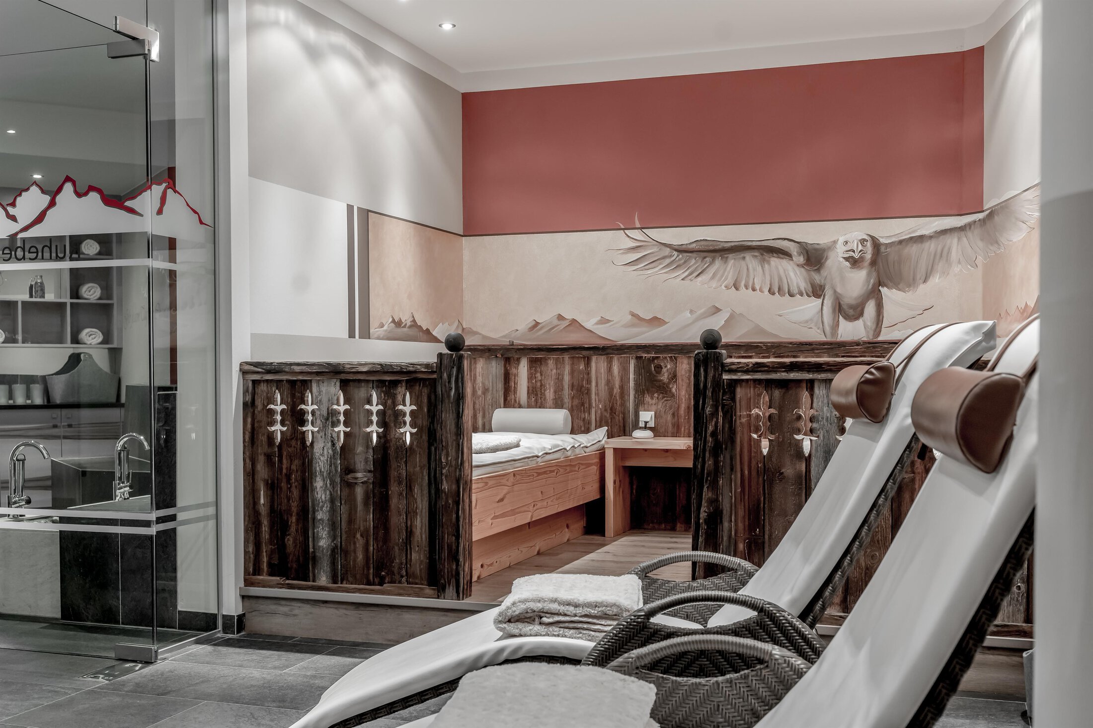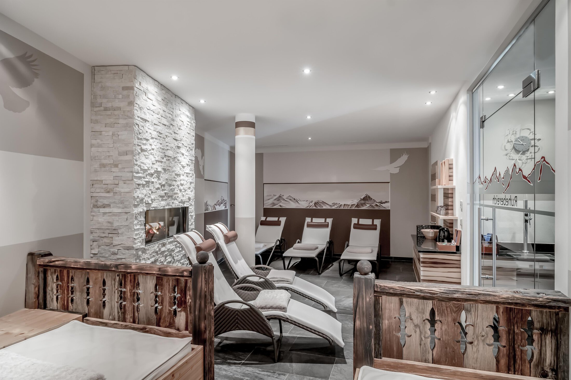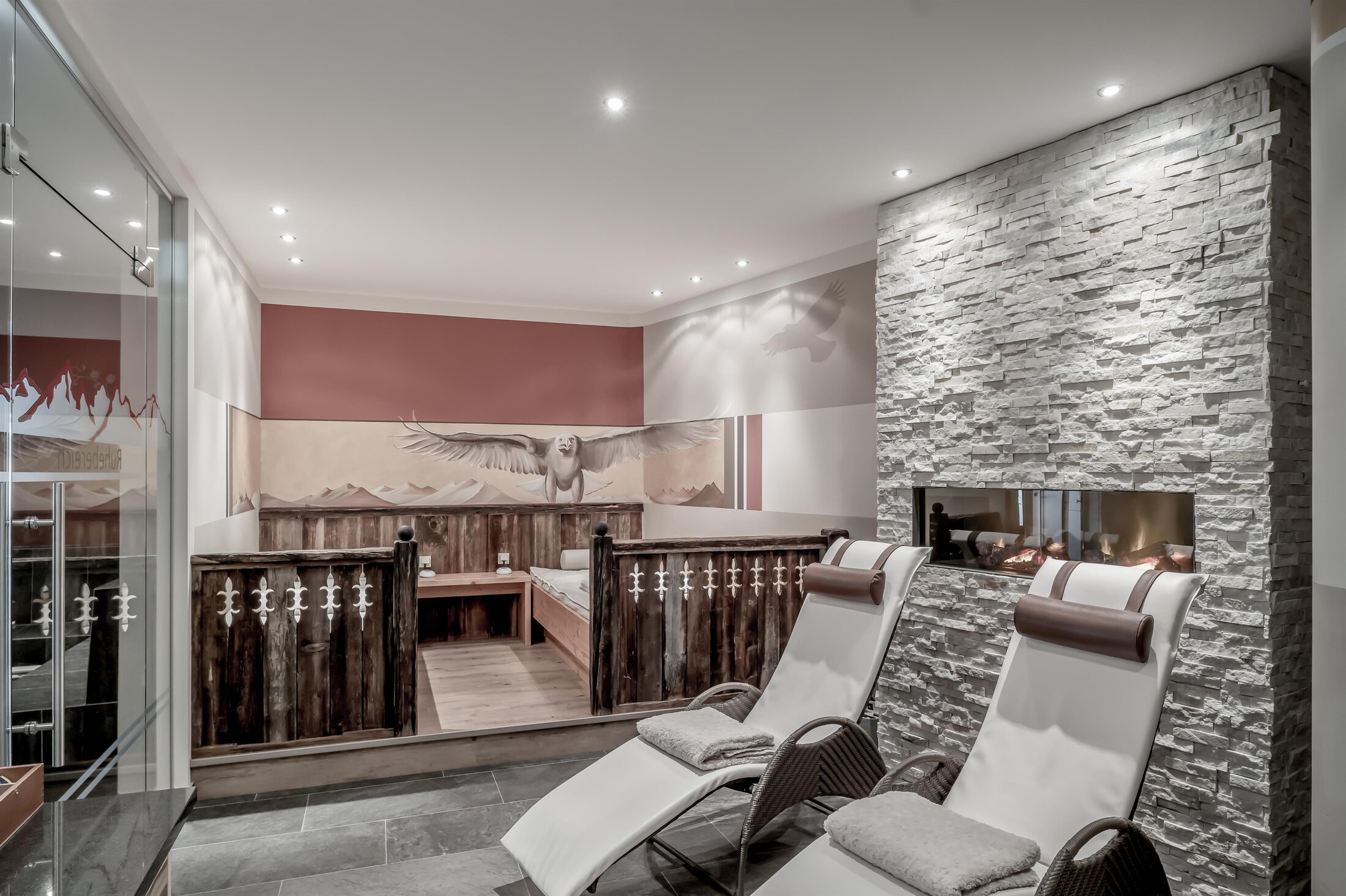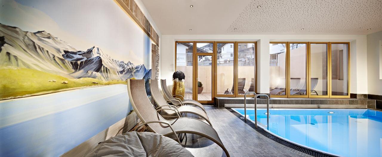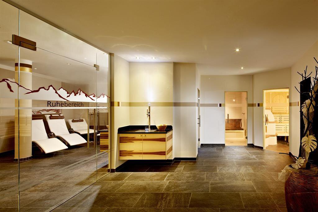 Included: wellness parlor with log cabin sauna, crystal steam bath, infrared cabin/photo therapy, Kneipp footbath, heat bench, power showers, relaxation zone with water beds and indoor pool; sauna towels/hand towels, bathrobe, parking lot, ski storage room with boot dryer, high speed WiFi;