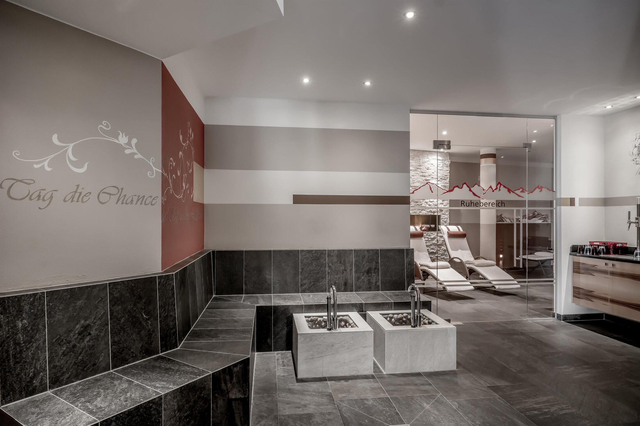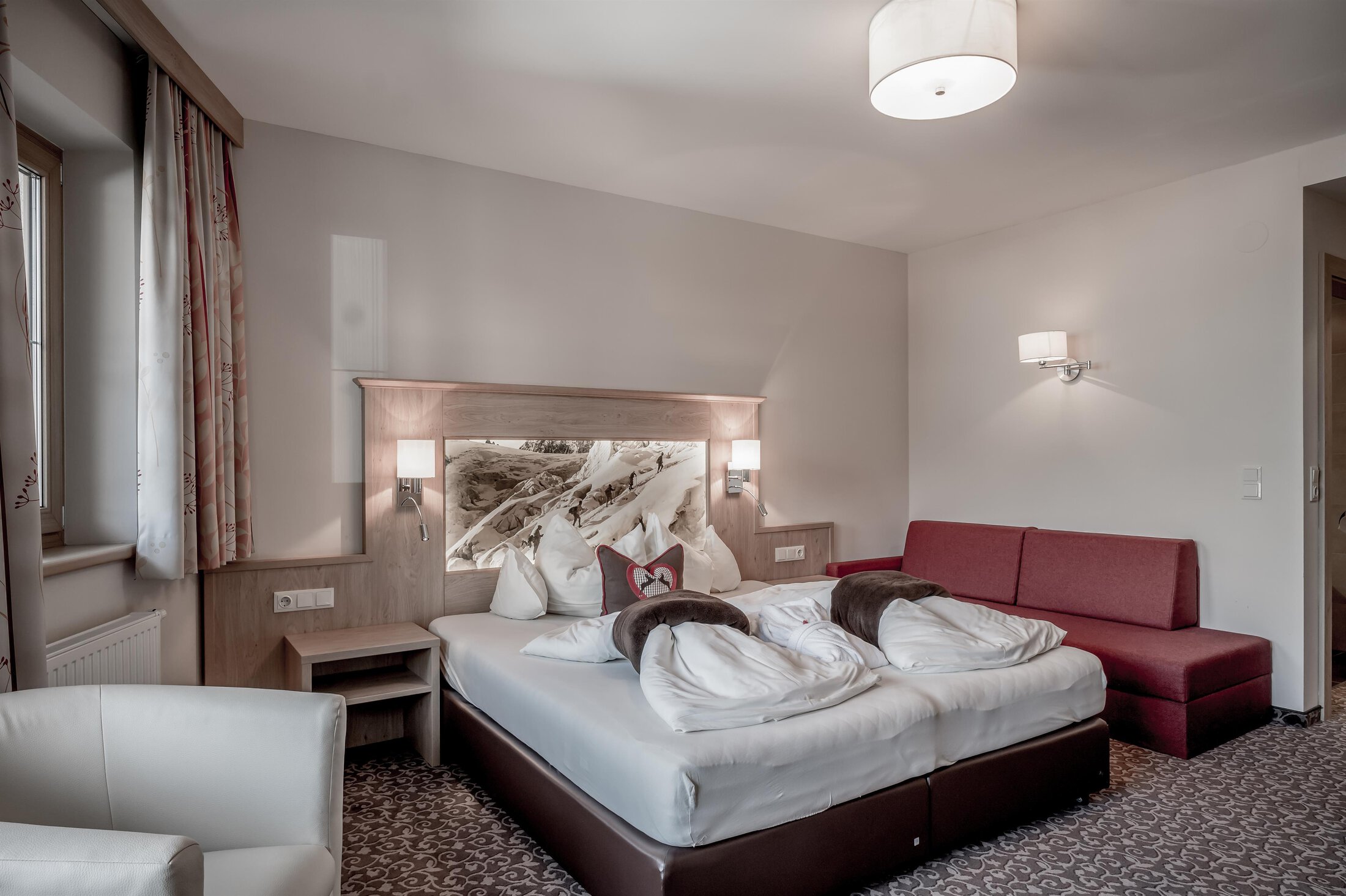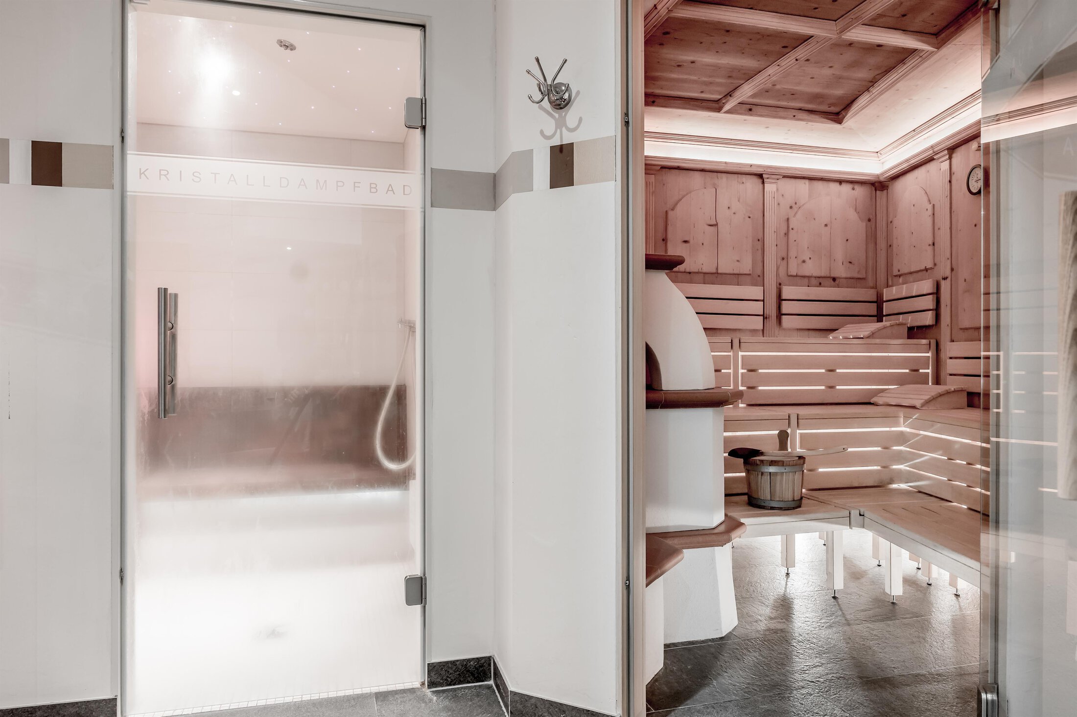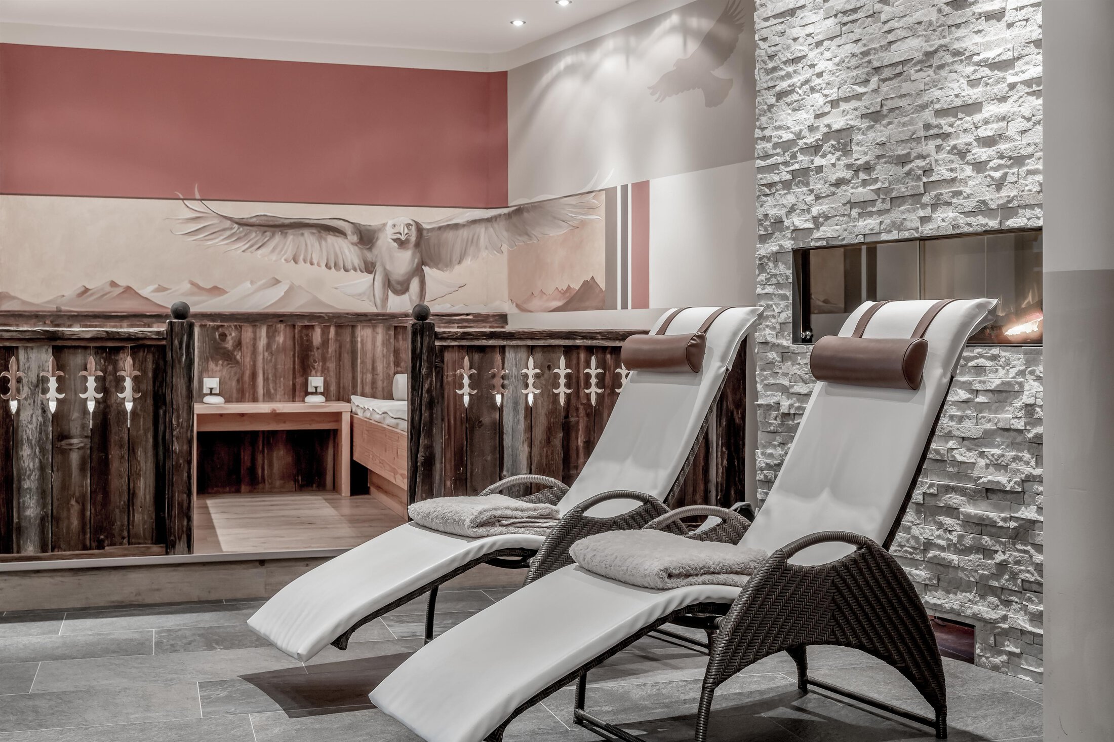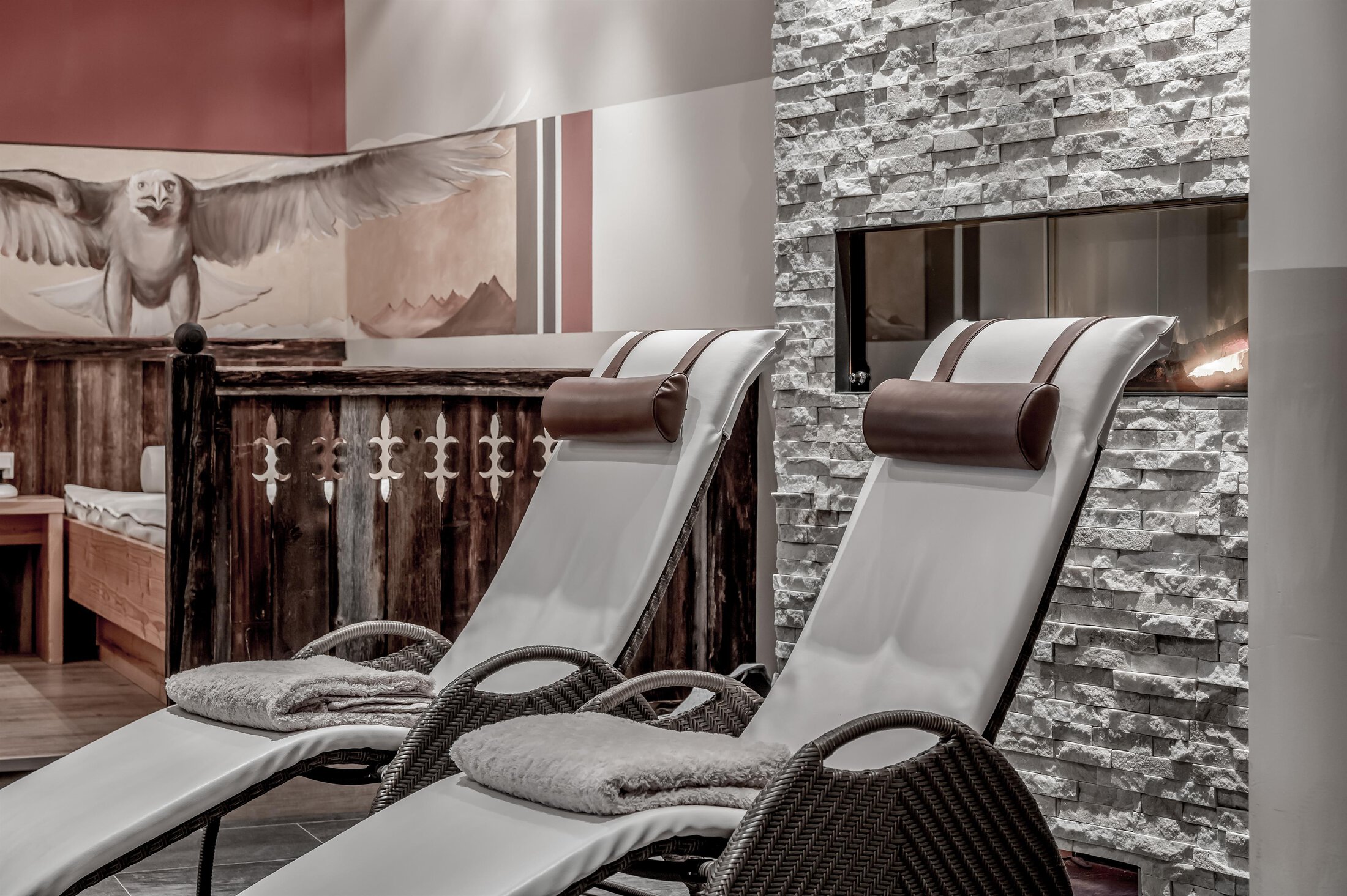 Included: wellness parlor with log cabin sauna, crystal steam bath, infrared cabin/photo therapy, Kneipp footbath, heat bench, power showers, relaxation zone with water beds and indoor pool; sauna towels/hand towels, bathrobe, parking lot, ski storage room with boot dryer, high speed WiFi;