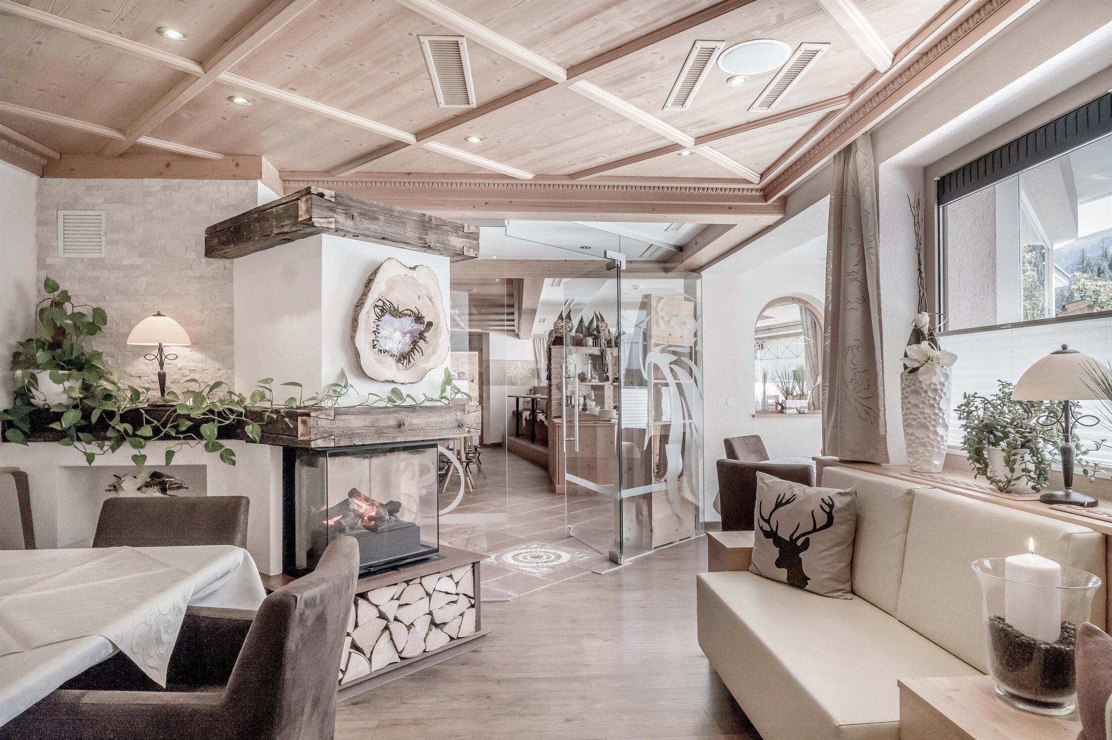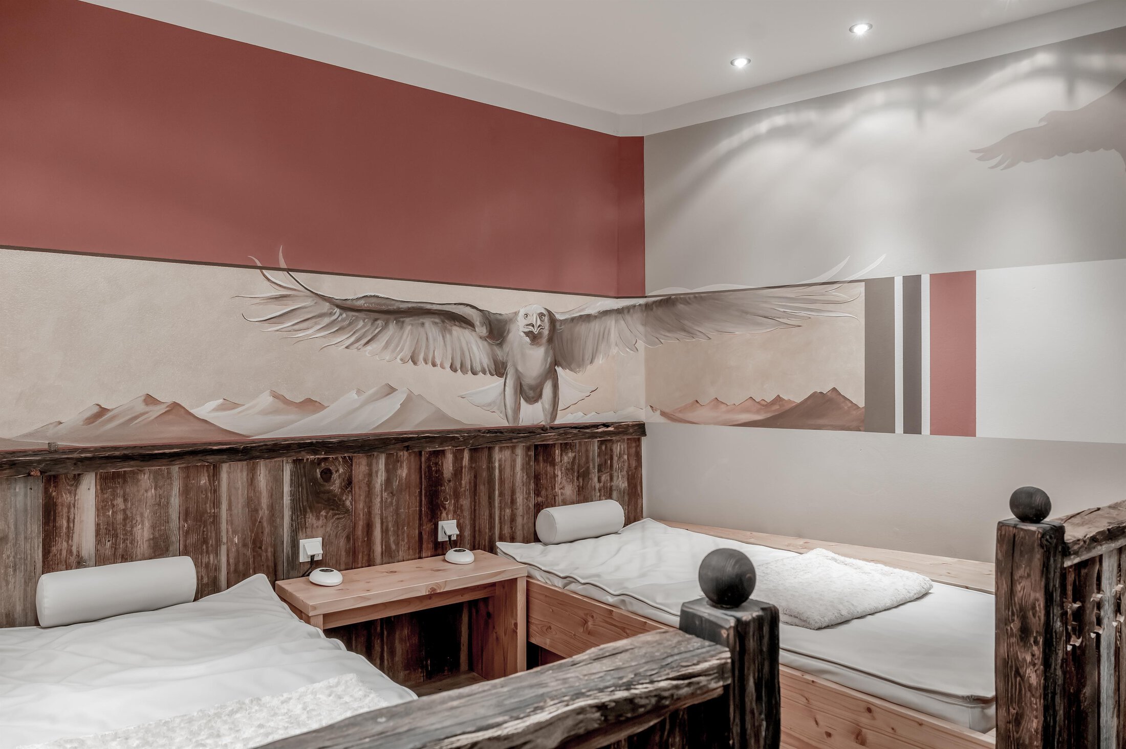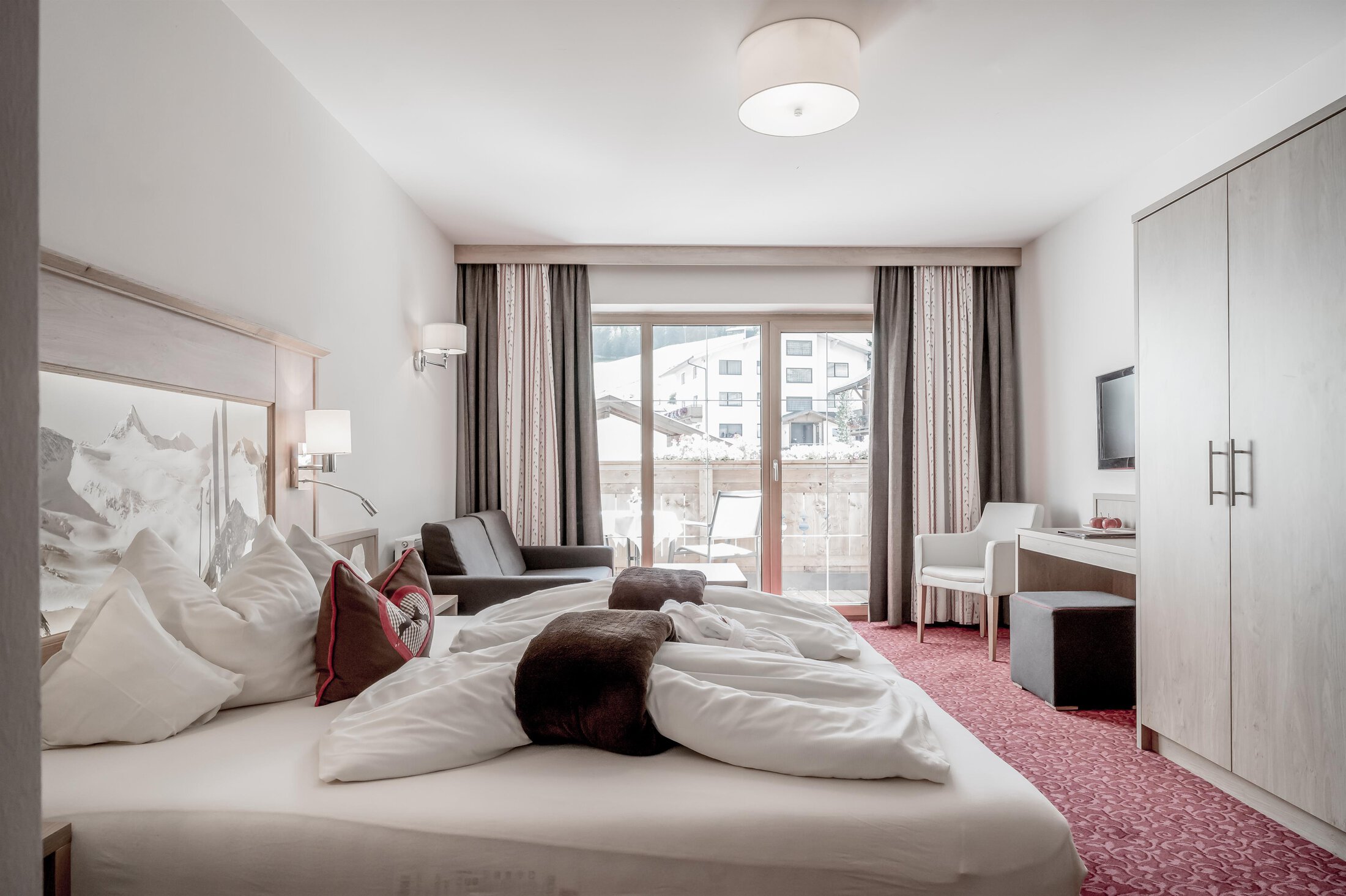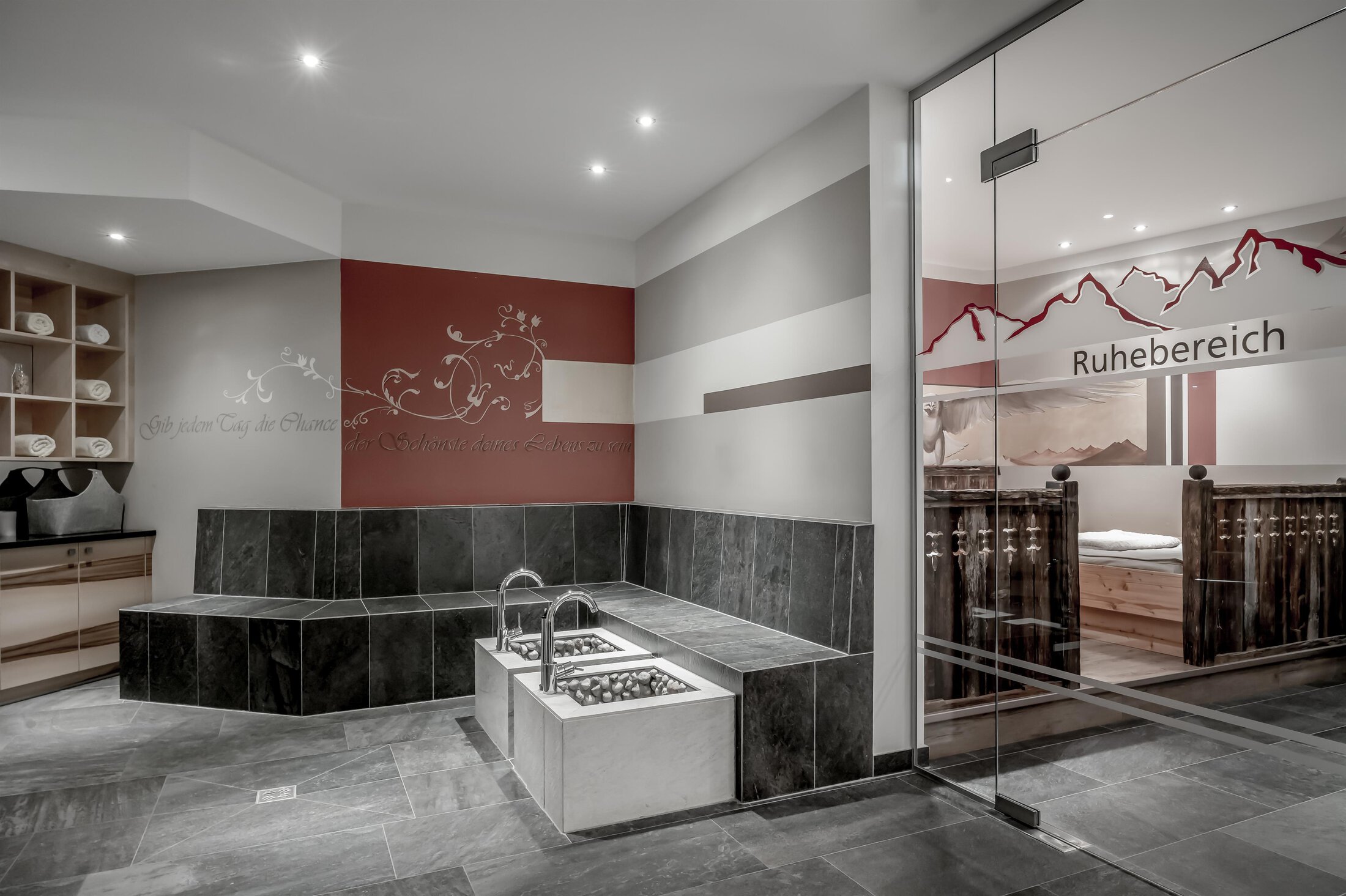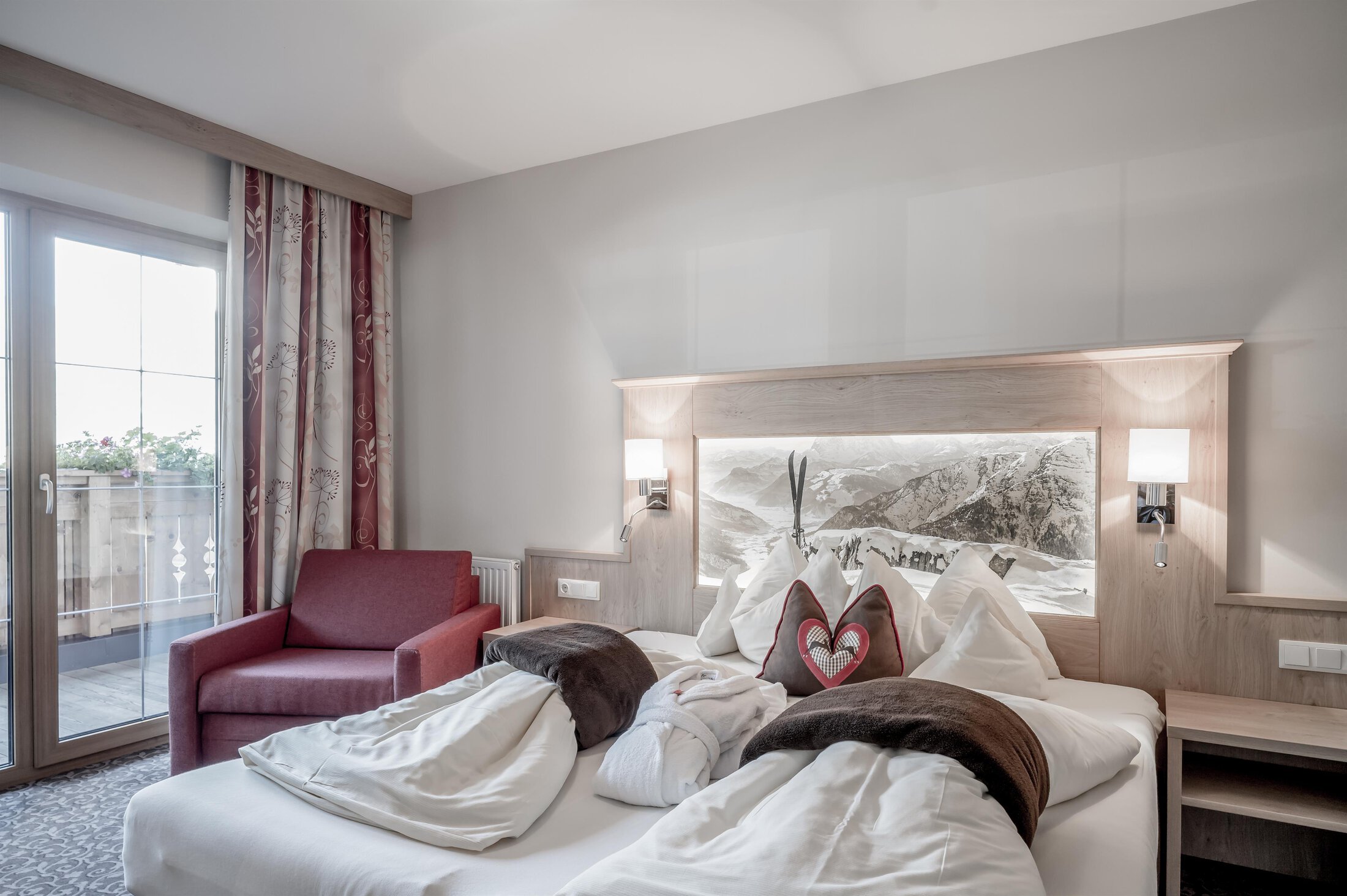 Included: wellness parlor with log cabin sauna, crystal steam bath, infrared cabin/photo therapy, Kneipp footbath, heat bench, power showers, relaxation zone with water beds and indoor pool; sauna towels/hand towels, bathrobe, parking lot, ski storage room with boot dryer, high speed WiFi;